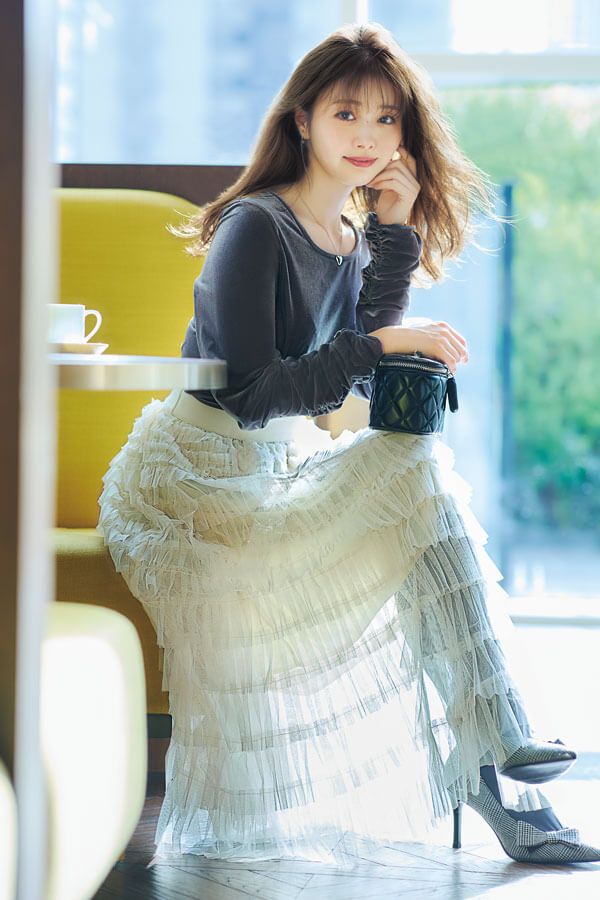 淡い色みだと糖度高すぎになるので、辛口な締め色を混ぜ込んで。ベロア素材やほどよい肌見せを駆使した大人っぽさ演出も効果的です。 バレエのチュチュを連想させるボリューミーな白のスカートは、ひざ下がしっかり透けるセンシュアルなデザイン。