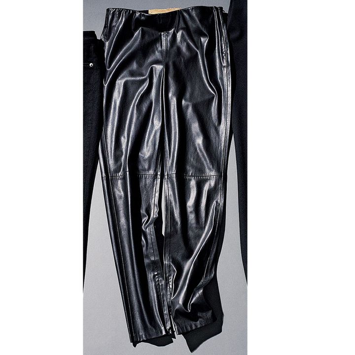 レザーのトレンドに乗って一本あると今年らしく見えるエコレザーは、ウエストゴムなうえにストレッチが利いて、はき心地抜群。裾のファスナーもポイントに。