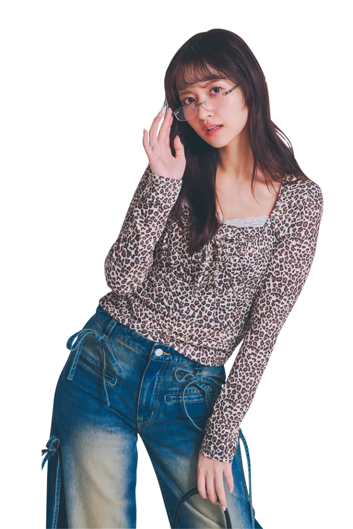 レオパードコンパクトトップス 2,199円/W♥C リボンデニムパンツ 14,300円/merry jenny メガネ 1,650円/スピンズ バッグ/スタイリスト私物