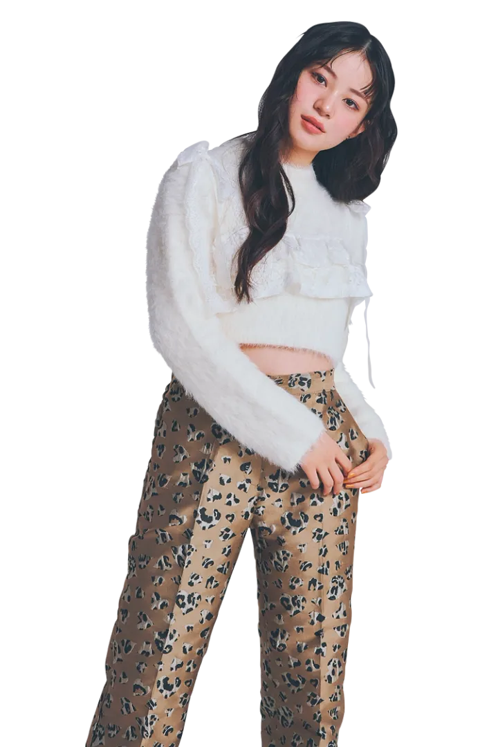 レオパードパンツ 16,500円/The Girls Society 白ショート丈ニット 13,000円/X-girl(X-girl store) 白レースビスチエ 6,600円/merry jenny イヤリング 1,870円/GOLDY