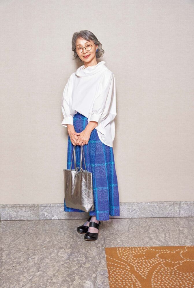 布作家の清田一美さんはお手製の白ブラウスに、フランスのヴィンテージスカートを合わせた可憐な装い。柄物もボトムスなら取り入れやすく、装い全体が華やぎます。足元は可愛いデザインと抜群の履き心地で人気の「ダンスコ」。