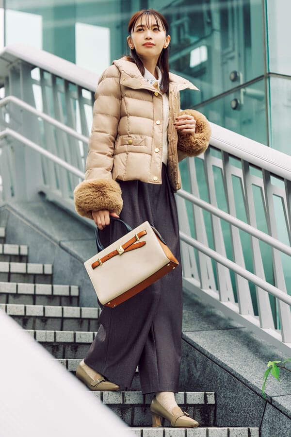 小物を見直すだけで、ダウン×パンツでも品格アップが可能に。バイカラーやエレガントなボウデザインでバッグや足元に箔をプラス。