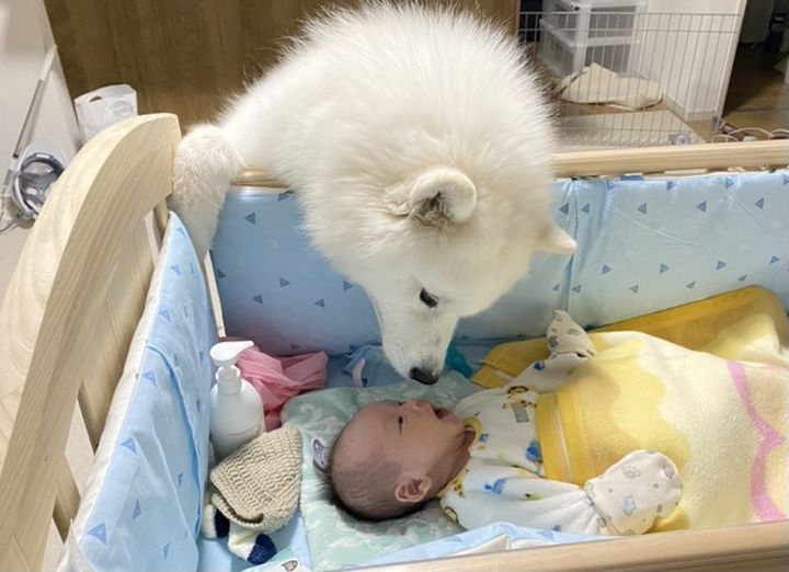 サモエドの女の子、こはくちゃんと暮らす投稿者・サモエド こはく(@kohaku_Samoyed)さんはある日、ベビーベッドで寝ている赤ちゃんと、のぞき込むこはくちゃんをカメラに収めました。その見つめ合っているようなかわいいお写真に、注目が集まりました。