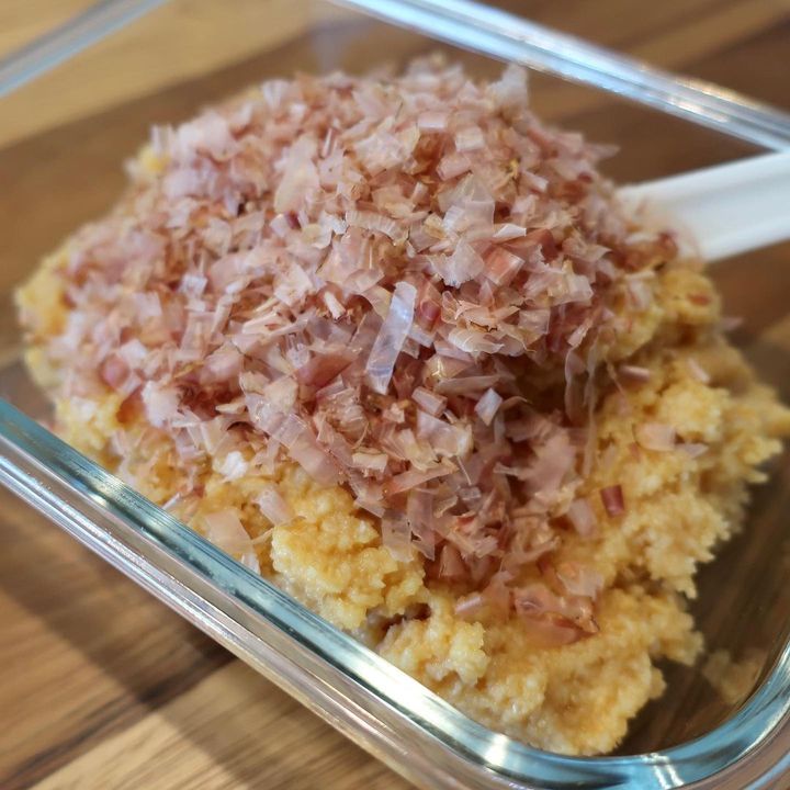 1. タッパーに味噌とかつお節を入れて、まんべんなく混ぜ合わせる。