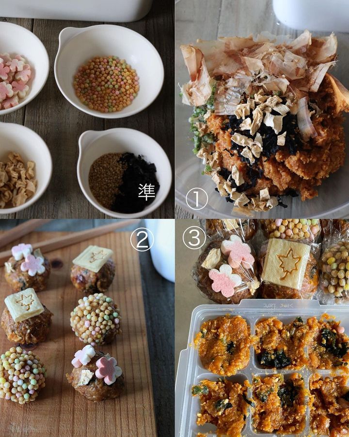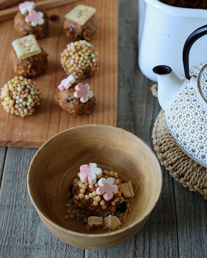 2. 直径2cm程度に丸めて、お麩やあられなどお好みの具材をのせる。