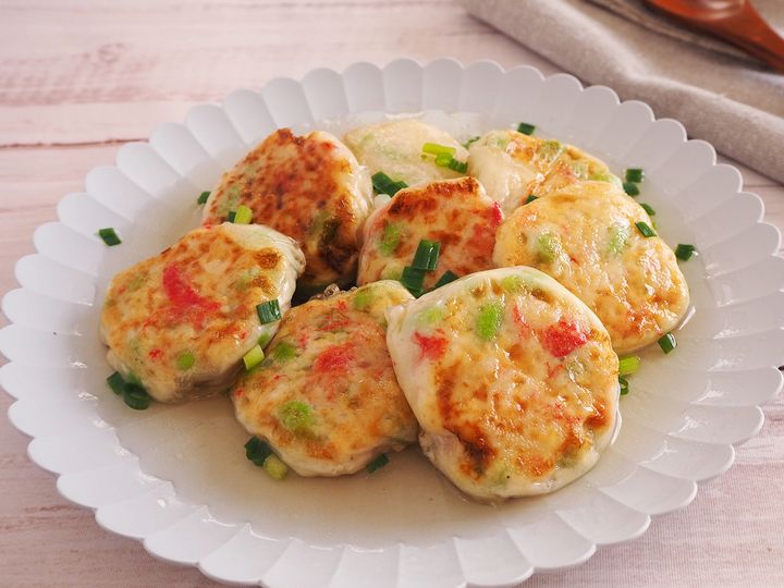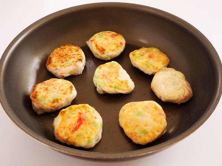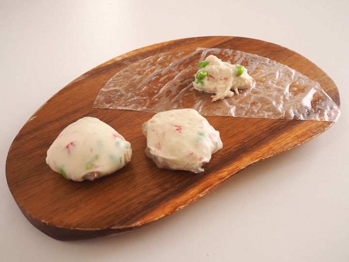 ペースト状にしたお豆腐にカニカマや枝豆を混ぜることで、色合いもかわいく。それをライスペーパーで包んで、少量の油で揚げ焼きしていきます。