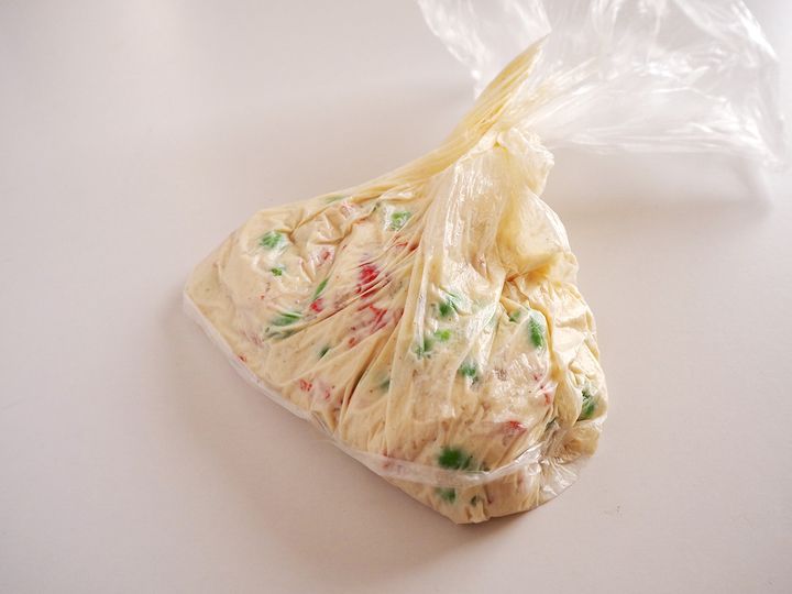 1. 絹豆腐をポリ袋に加え、袋の上からペースト状になるまで揉む。そこにほぐしたカニカマ、枝豆とAを加えて混ぜる。