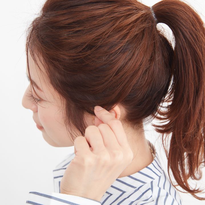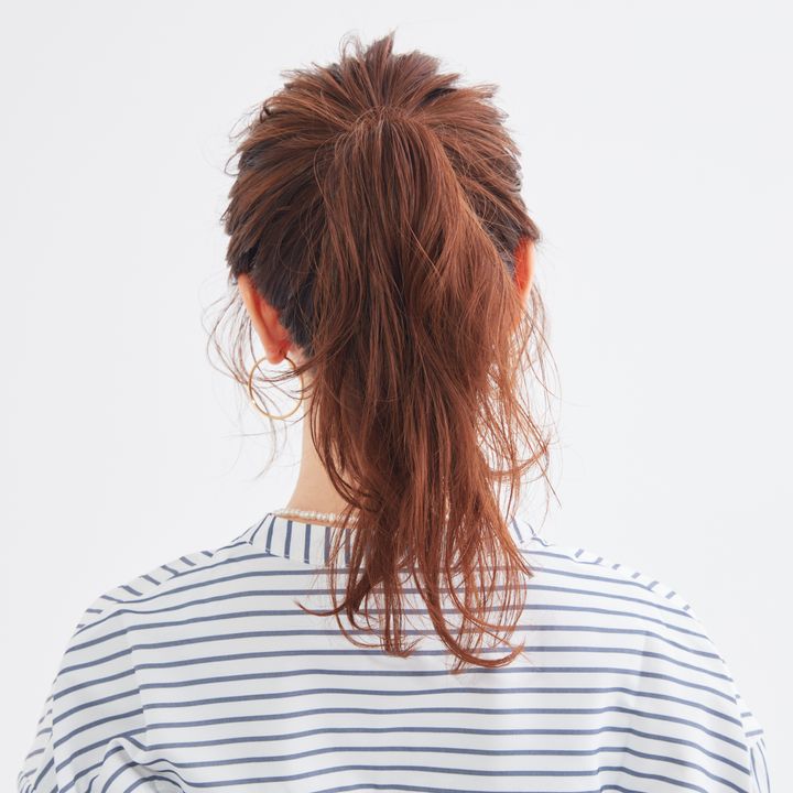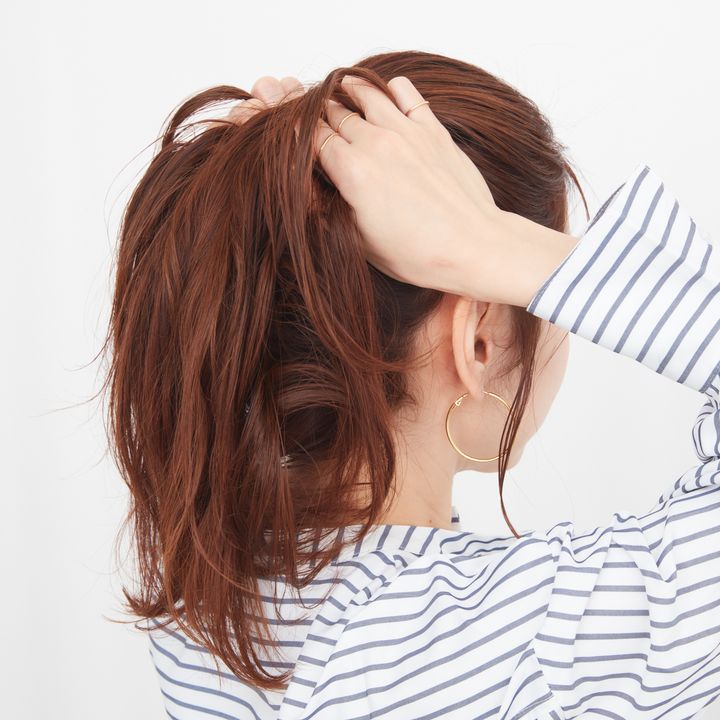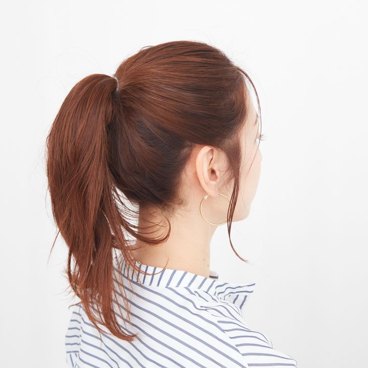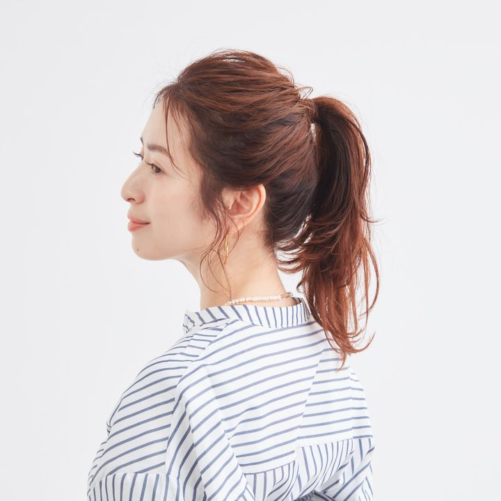 高めのポニーテールは可愛いけれど、「子どもっぽい?」「ボサボサとおくれ毛が出て生活感が出てしまう」という悩みも。「大人のポニーテール」は、結ぶ位置とあえてくずすひと手間がポイント。あご〜耳の高い位置の延長上で結び、横から見た時に丸いフォルムになるよう毛束を引き出すとバランスよく決まります。耳にかかるようサイドの毛束を調整すれば、360度美しい高めポニテに。