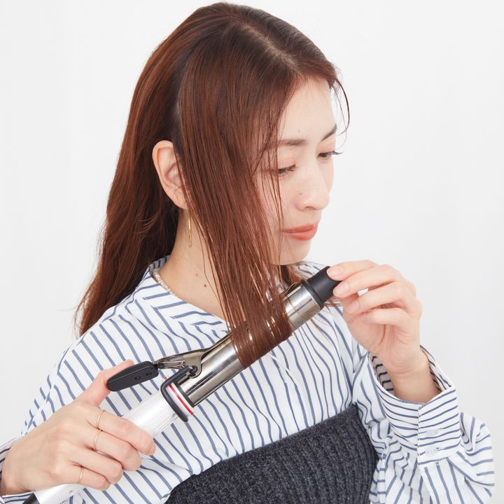 1.32㎜程度の太さの͡コテで全体を内巻きに。根元の立ち上がりとくしゃっとこなれた雰囲気を出すために、頭頂部の根元にもアイロンを入れてふんわりとさせておく。真ん中、両サイドの3カ所を目安に。