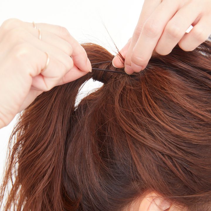 6.仕上げにポニーテールの毛束を少量取り、ゴムに巻きつけてピンで留める。