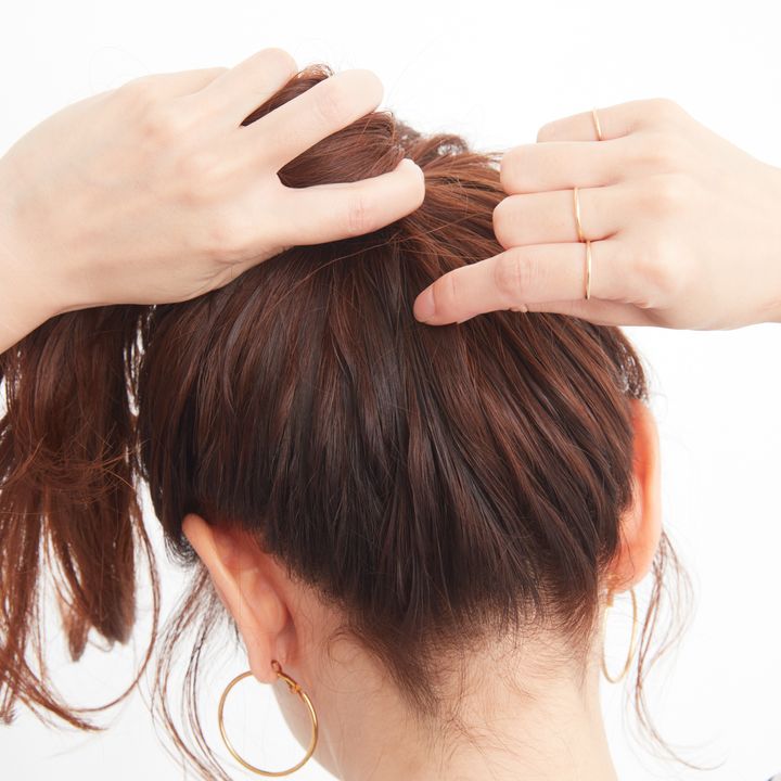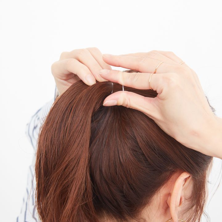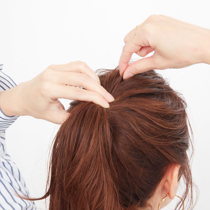 4.ゴムをずれないように押さえながら、トップの毛束を少しずつ引き出す。ゴムの下側の毛も引き出しておくと横から見た時のシルエットがふんわり丸くなってきれい。