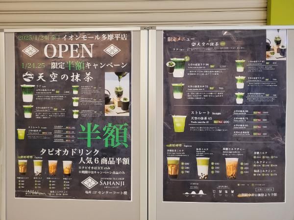 【開店】限定半額キャンペーンも!抹茶&タピオカドリンク専門店「SAHANJI」、1/24(金)イオンモール多摩平の森にオープン