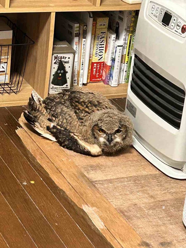 ストーブの前で暖をとるフクロウ。このかわいさは本当に猛禽類?「ちゃんと暖かい場所を知ってるんだ」「かわいさに悶絶」