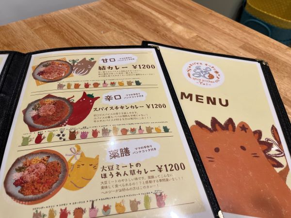 メニューを拝見。 娘さん考案! 子どもも食べられる甘口の「結カレー」(1200円) 辛さやスパイス好きには辛口の「スパイスチキンカレー」(1200円) ヘルシーがお好みには、薬膳「大豆ミートのほうれん草カレー」(1200円)