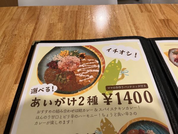 お得!! 組み合わせ自由のあいがけ2種(1400円)と 欲張りメニュー3種(1600円)もありますよ♪