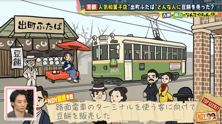 さっそく今出川通を訪れた河合と古川アナは、広い交差点に注目し、かつてここは路面電車が通っており、桝形の広場はターミナルだったと推測。「そこで乗り降りするお客さん方に愛してもらったから、出町ふたばはあの場所でずっと愛されるお店になった」と結論付けた。