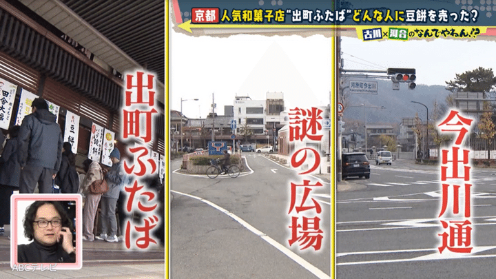 行列が絶えない出町ふたばは、なぜ河原町や祇園といった繁華街ではなく、出町柳に店を構えたのか? 同店の店長いわく、この地でないとダメな理由があるという。その理由を探ろうと、河合と古川アナが周辺店舗に聞いてみると、出町ふたばの前の広い道路がかつて広場だったことがわかった。広場は、上空から見ると桝の形をしていたらしい。