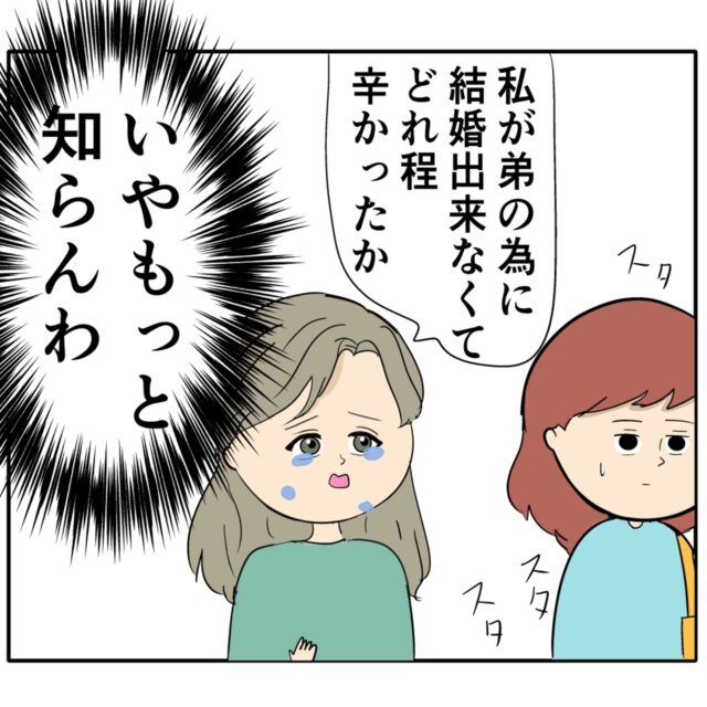 すると、「私が弟の為に結婚できなくて、どれほど辛かったか」構わず続けるジュリ実さんに、「いやもっと知らんわ」心の中でツッコミを入れつつ、めいさんは歩き続けました。