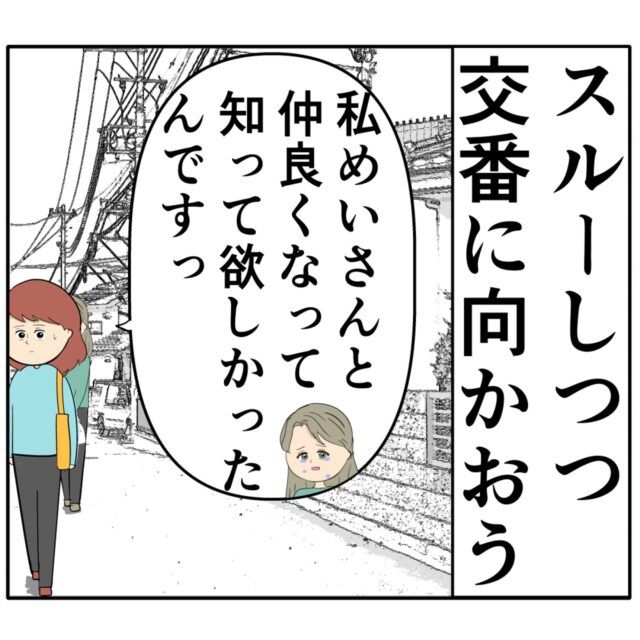 「スルーしつつ交番に向かおう」そう思いながらスタスタと歩き出しためいさんに、「私、めいさんと仲良くなって、知って欲しかったんですっ」ジュリ実さんが話しかけました。