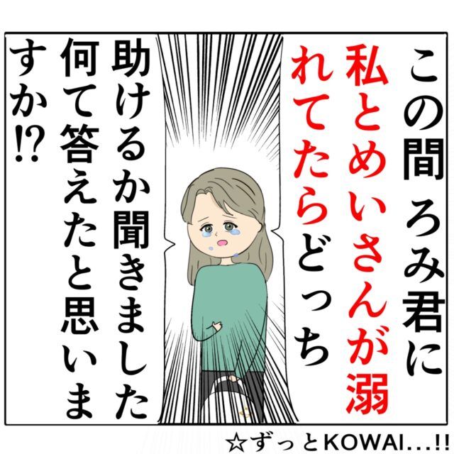 「この間、ろみ君に、私とめいさんが溺れてたらどっち助けるか聞きました。なんて答えたと思いますか!?」涙ながらに突然繰り出したジュリ実さんのクイズに、思わず震えあがるめいさんでした。