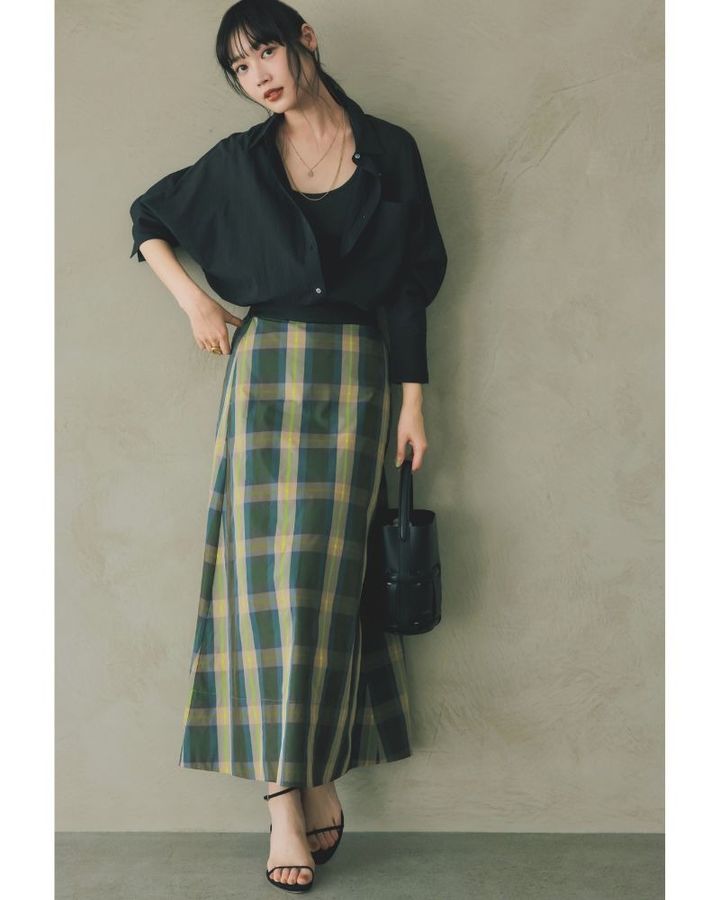 カラーのチェックスカートを品よく着こなすなら、合わせるアイテムをダークトーンで統一して。ブラウス、バッグ、シューズをブラックで統一することで、全体的にシックな印象に落ち着き、スカートの存在感が引き立ちます。重く見えないよう、デコルテや足元を肌見せするとより◎。