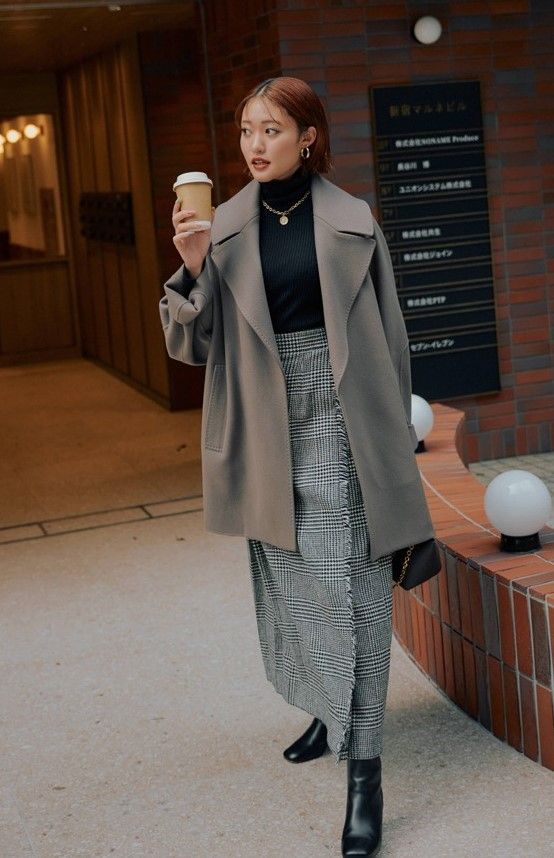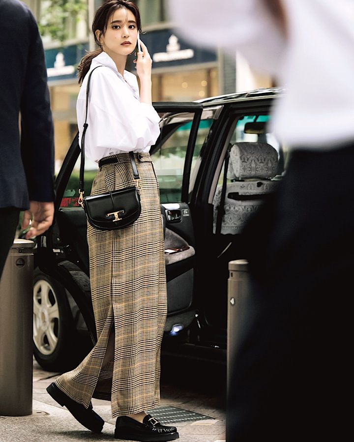 定番の白シャツ×スカートコーデも、チェック柄を取り入れることで一気に冬モードへ。スリットの入ったデザインのIラインスカートなら足捌きもよく、通勤スタイルにもぴったりです。仕上げにかっちりした黒のバッグやローファーで、トラッドテイストにまとめて。