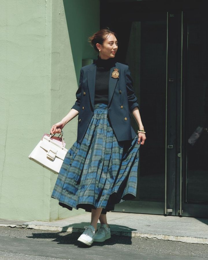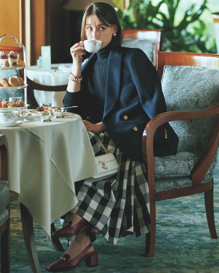 甘口なチェック柄のボリュームスカートは、かっちりめのアイテムとの組み合わせが好バランス。正統派の紺ブレやタートルネックを合わせることで、スカートの存在感を上手に中和してくれます。バッグやアクセサリーに光るさりげないゴールド使いにも注目を。