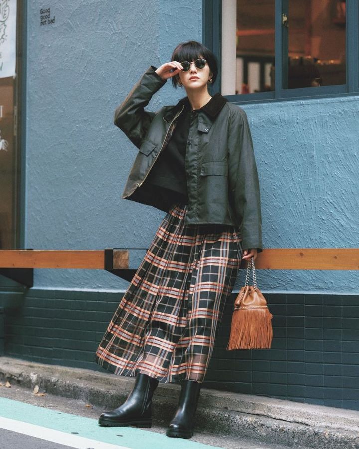 スタイリングによっては幼く見えてしまいがちなチェックスカートは、合わせるアイテムがとても重要。メンズライクなブルゾンを合わせて、辛口モードに味変すれば、キリッと引き締まった印象に仕上がります。。仕上げに秋らしい色味のレザーバッグで、大人の遊び心をプラス。
