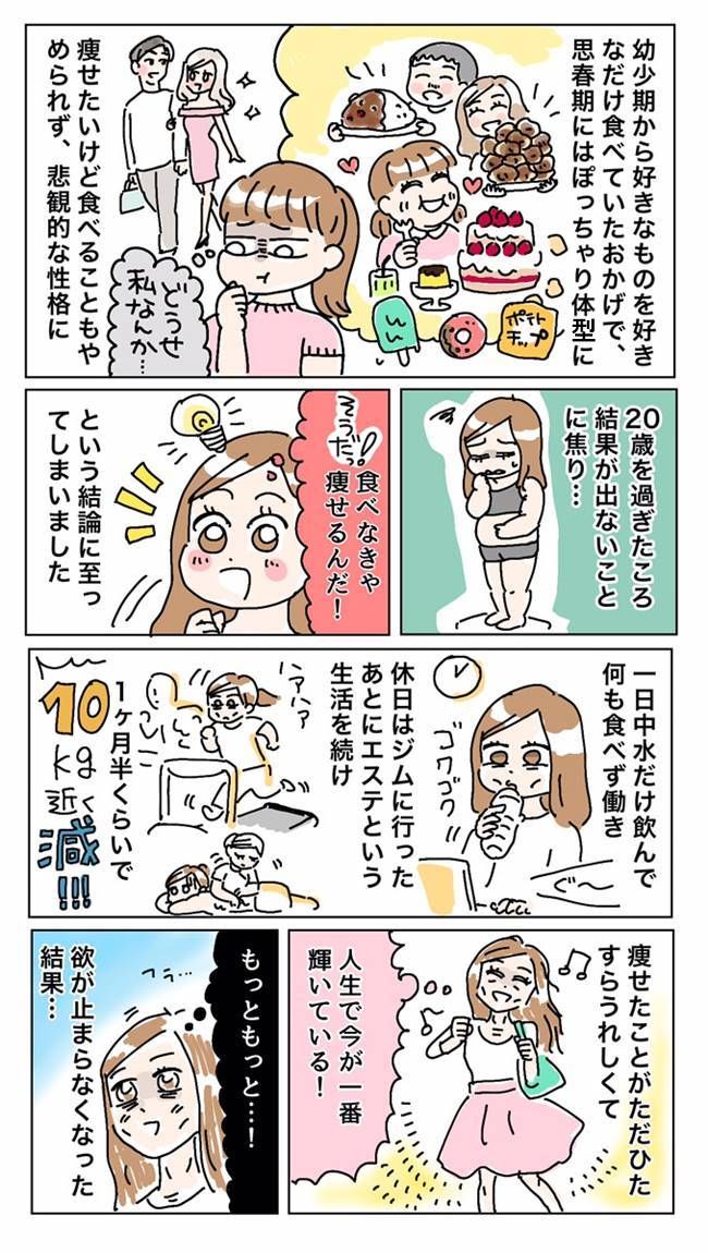 幼少期から好きな物を好きなだけ食べさせてもらえる環境だったためか、思春期にはだいぶぽっちゃり体型に。痩せたいけど食べることもやめられない、そんな葛藤が続き「どうせ私なんか痩せられないんだ」と悲観的な性格に。