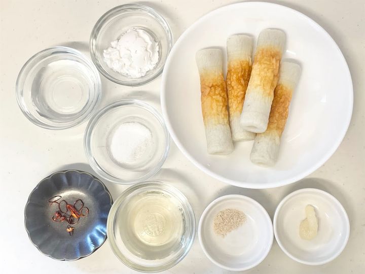 1. ちくわを縦にカットして4等分にしたらちくわを結びます。
