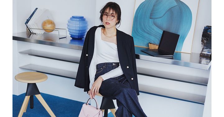 カットソー¥3,990(Gap)ジャケット¥22,000(ステートオブマインド/ゲストリスト)デニム¥9,900(ミラ オーウェン/ミラ オーウェン ルミネ新宿2店)バッグ¥572,000(ヴァレクストラ/ヴァレクストラ ジャパン)メガネ¥42,900(アイヴァン/アイヴァン 東京ギャラリー)ピアス¥162,800(GIGI/ホワイトオフィス)ネックレス¥23,320(エムシー・スタジオ/ZUTTOHOLIC)リング〈中指〉¥119,900(マリハ)リング〈小指〉¥99,000(アルティーダ ウード/アルティーダ ウード〈ジ アナザー ミュージアム〉)靴¥73,700(ネブローニ/ピモンテ)
