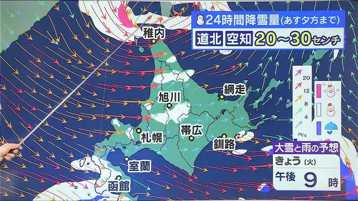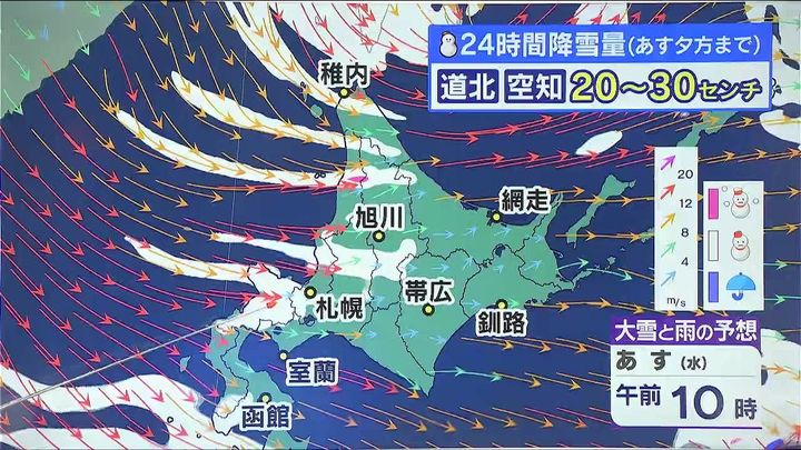 西風がやや強く、日本海側を中心に雪が降り、ふぶきます。日付が変わると空知や道北で紫色、雪が強まるでしょう。