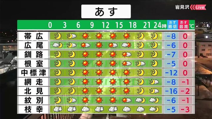 枝幸で時折雪が降る他は、広く晴れるでしょう。朝は北見で‐16度と冷え込みます。日中も‐1度前後でこの時期らしい寒さでしょう。