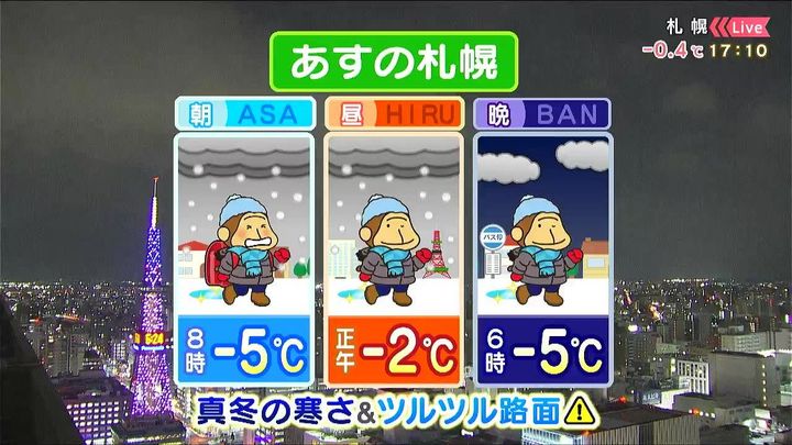 朝は10日ぶりに‐5度以下となりそうです。大雪にはなりませんが、フード付きの上着でしっかり防寒対策をして、ツルツル路面にも注意して下さい。