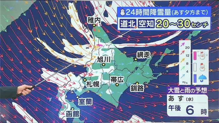 札幌も日中は時折、雪の降る時間がありそうです。15日の夕方、午後6時までの24時間に降る雪の量は、道北や空知地方の多いところで20~30センチの大雪になるでしょう。