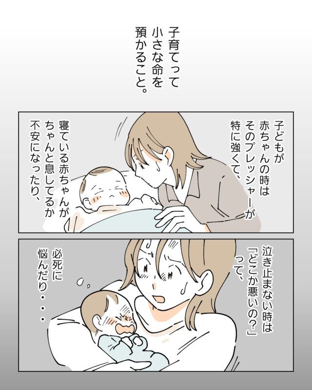 子どもが赤ちゃんの時はそのプレッシャーが特に強くて、寝ている赤ちゃんがちゃんと息してるか不安になったり、泣き止まない時は「どこか悪いの?」と必死に悩んだりするものです。