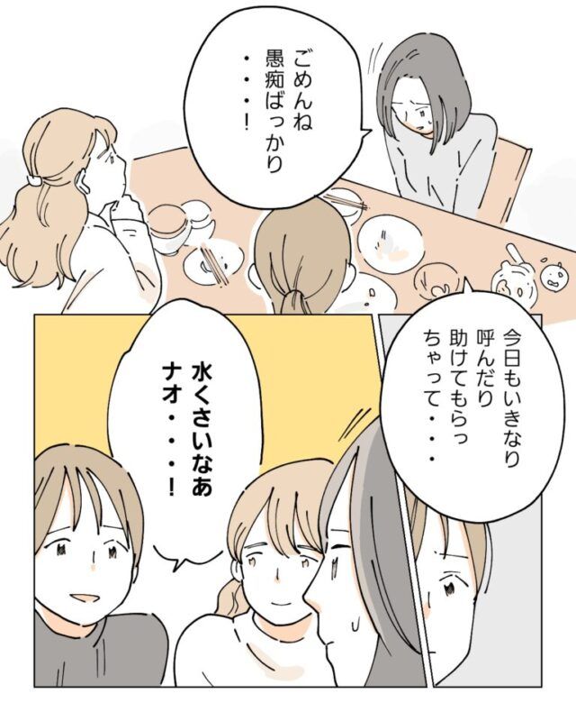 ナオは心に溜まっていた辛い気持ちを打ち明けた後、「ごめんね、愚痴ばっかり」と申し訳なさそうに言いました。「今日もいきなり呼んで助けてもらっちゃって・・・」と下を向いたままです。そんなナオに、私は「みずくさいなぁナオ!」と言いました。