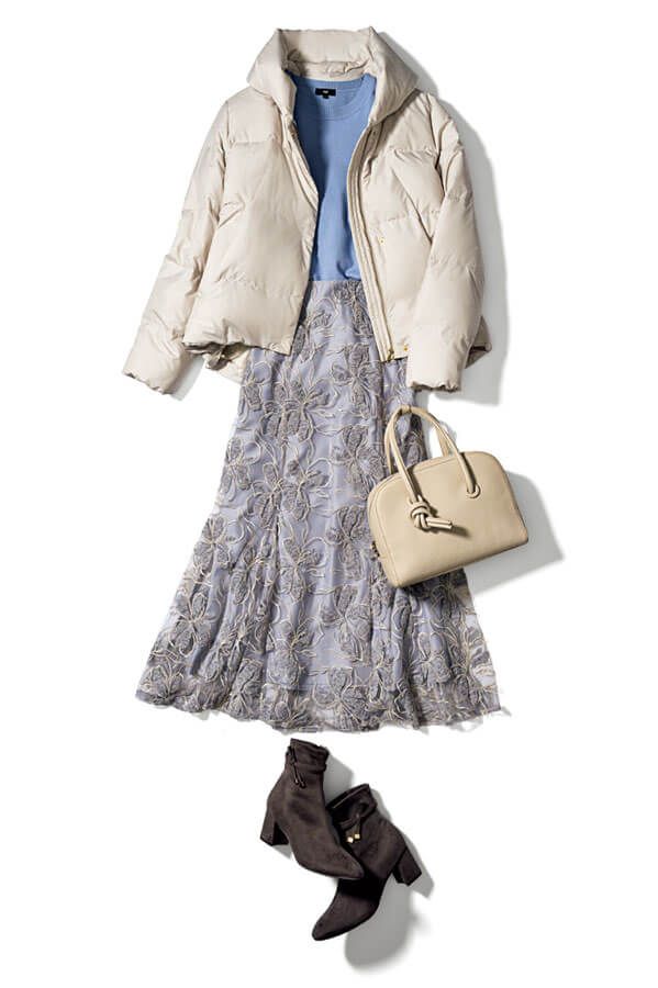 オフィスになじむベージュカラーは品格の演出もお得意なので、ブルートーンを基調にした清楚配色で聡明な印象を際立てて。暖かいのに細見えが叶う、上質素材を使用したショートダウンはスタンドカラー風なデザインも品顔。