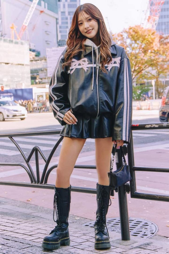 胸元のリボンのプリントが可愛いレザージャケットは、SHEINで約3,000円♡ スカートをレザーであわせたのもポイント。