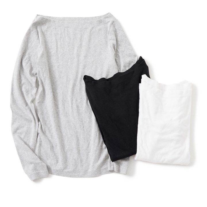 「Gapのボートネックカットソーは、グレー黒、白を3枚買い!着心地が良いうえに、乾燥機OKなのも頼もしい」(下田真里衣さん)