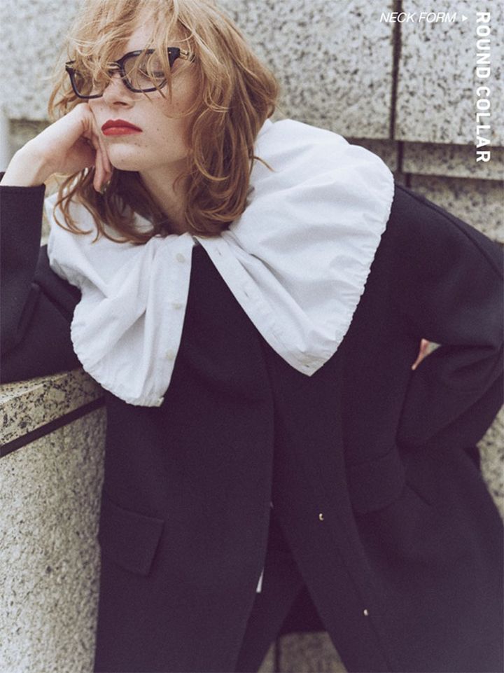 シャツのボリューミィなビッグカラーを襟から出して、デザインコートのように。ほのかに広がるAラインで、立体的な首元の主張を分散。上半身に重厚感が出るぶん、ボトムは極力細身を選び全体をすらりと。