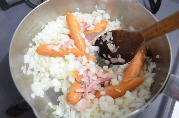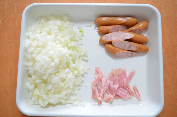 2. 玉ねぎはみじん切り、ベーコンは細切り、ウインナーは斜めに半分に切る。