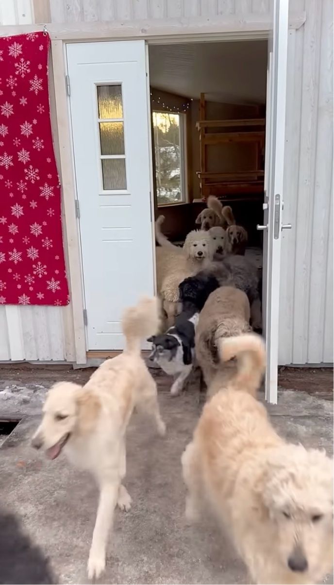 3. ドアが開けると飛び出してきたのは・・元気いっぱいなイヌたちが総勢14頭!?【海外・動画】
