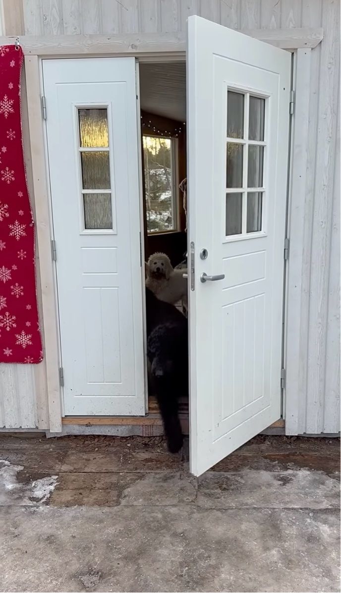 ゆっくりと開く大きな犬小屋のドア。 どうやら、誰かが内側から開けたみたいです。