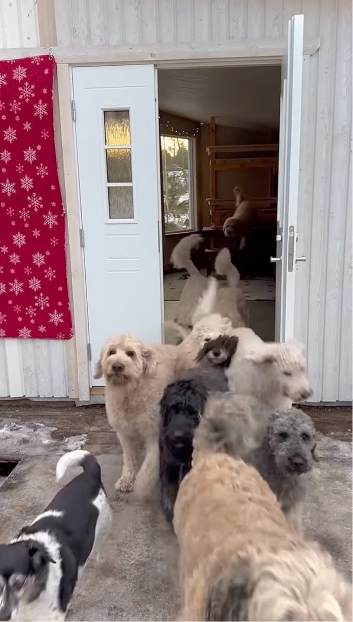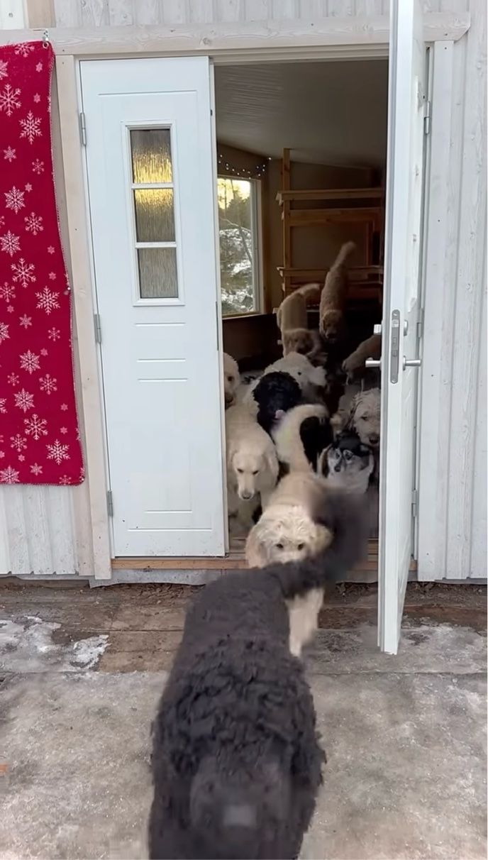 ドアが開けると飛び出してきたのは・・元気いっぱいなイヌたちが総勢14頭!?【海外・動画】