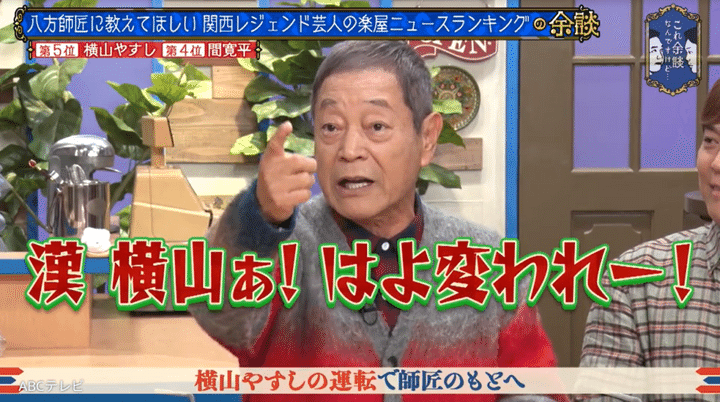 八方は、修業時代に数々の失敗をし、師匠の月亭可朝さんから破門を宣告されたという。大ピンチの若き八方を救ってくれたのが、横山さんだ。当時事情を知った横山さんは、「今晩のうちに謝りにいけ。明日ではもう遅い」「何も言わんと土下座して、ひと言すみませんでしたって」と八方に助言し、「よし、乗れ!」と、車を出してくれたそうだ。2人は京都を出発し、可朝さんが住む大阪の堺へ。ここから、横山さんの暴走運転が始まった。