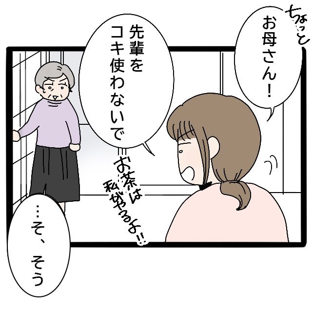 「ちょっとお母さん!先輩をコキ使わないで。お茶は私がやるよ!!」カオリさんがお母さんに物申すと「・・・そ、そう」と気まずそうなお母さん。
