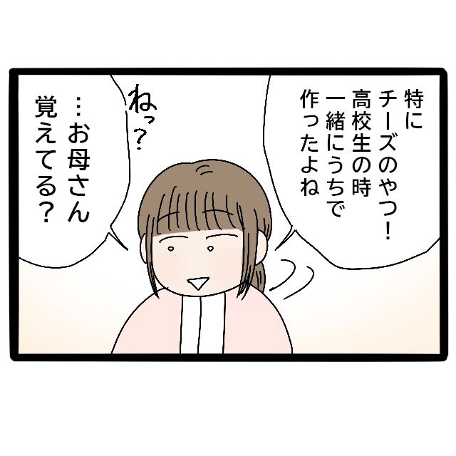 「特にチーズのやつ!高校生の時一緒にうちで作ったよね」そう言いながらカオリさんが「ねっ?・・・お母さん覚えてる?」とお母さんに話を振りました。
