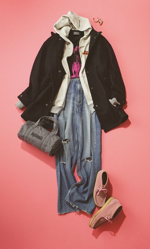 コート¥88,000パーカ¥36,300Tシャツ¥11,000デニムパンツ¥39,600バッグ¥19,800シューズ¥44,000(すべてヒステリックグラマー)ピアス¥21,{hlb}780(ソコ/ZUTTOHOLIC)