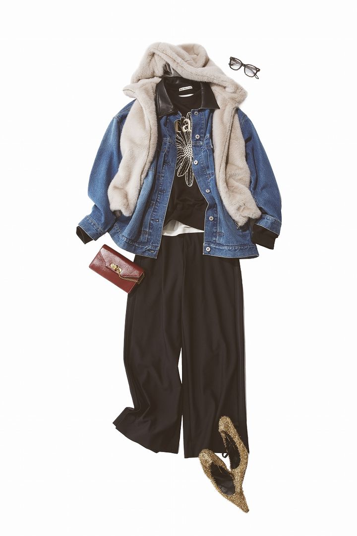 スウェットプルオーバー¥16,500(マルディ メクルディ/マルディメクルディジャパン)ファーベスト¥25,300デニムジャケット¥23,100(ともにアルページュストーリーオリジナル)ベロアプルオーバー¥11,990(インディヴィ/ワールド プレスインフォメーション)パンツ¥22,000(ルーニィ)バッグ¥11,900(チャールズ&キース/チャールズ&キース ジャパン)パンプス¥42,900(PIPPICHIC/ベイジュ)メガネ¥42,900(アイヴァン/アイヴァン 東京ギャラリー)